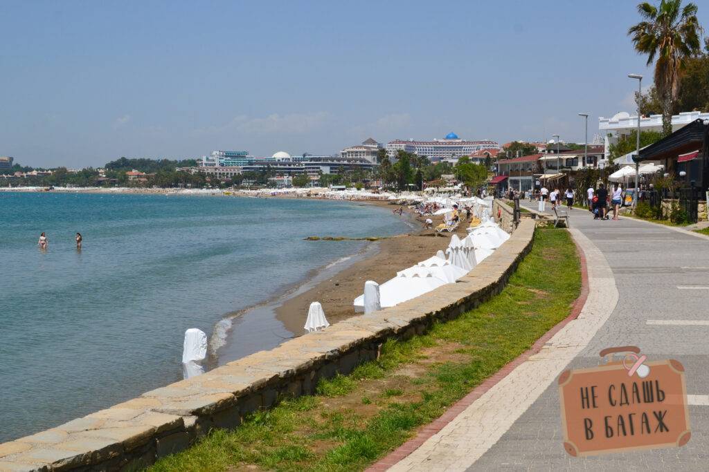 Пляжи справа от античного города менее красивые. Здесь пляж сильно уже, многие участки поделены на территории для отелей, поэтому посторонний человек здесь не может загорать на своем полотенце. Зато здесь длинная набережная, самое то для длинных прогулок, пробежек и катания на велосипеде.
