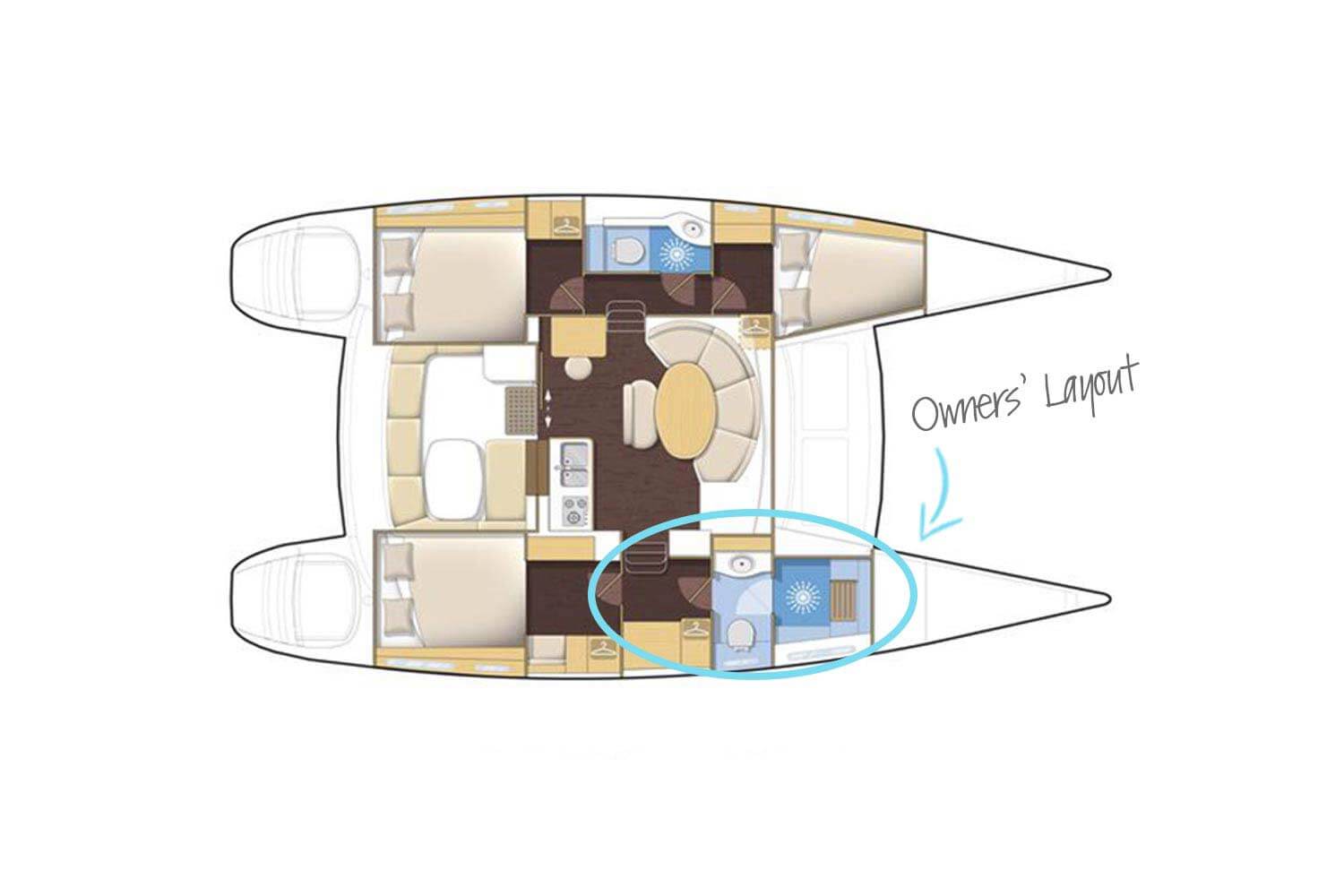 What is an owners’ version catamaran? This desirable catamaran layout has three cabins instead of four cabins (referred to as a charter version). Meaning, there is a spacious bathroom (head) in the place of the fourth cabin in the owners’ hull.