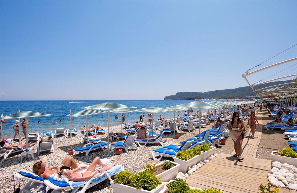 Пляж у отеля средне — галечный, типичный для Кемера. Туристов очень много, пляж узкий. Вход в море удобный.
