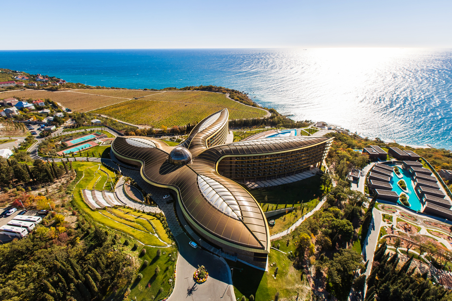 Новая Ялта — фешенебельный спальный квартал, который активно застраивают необычными футуристическими зданиями. Именно в этом районе стоит искать лучшие отели. Один из них — Mriya, который не отличишь от арабских резортов.
