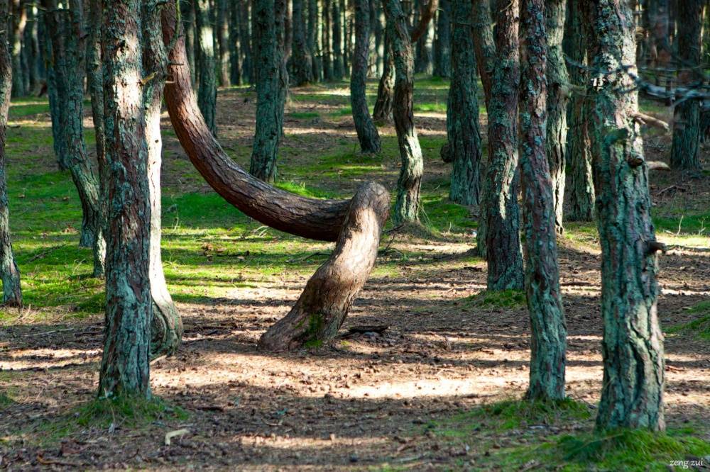 Знаменитый «пьяный», или «танцующий» сосновый лес находится в национальном парке «Куршская коса» в Калининградской области. Деревья высадили в 1961 году. Спустя некоторое время стало видно, что подросшие сосны на небольшом участке имеют необычную форму: их стволы закручиваются в спирали и кольца.