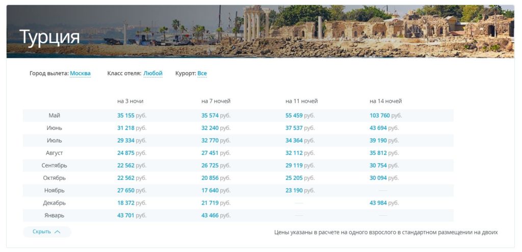 Если вам не принципиальны даты, и вы знаете только месяц, в котором идете в отпуск – пользуйтесь смело этим календарем. В нем сразу видно сколько стоит самый дешевый тур по месяцам, на разное количество дней! Причем задать поиск и посмотреть на цены можно из разных городов, не только из Москвы.