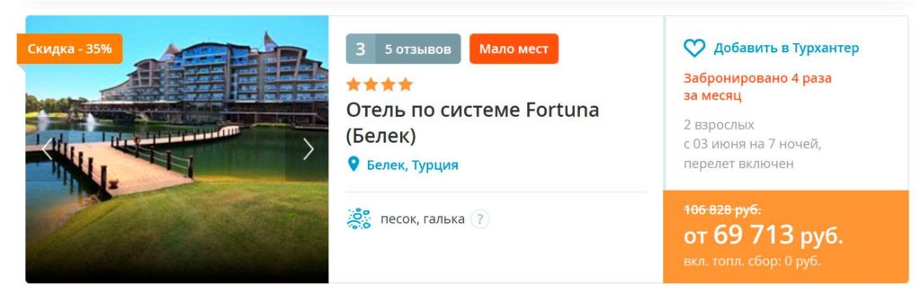 Очень удобно, что на Travelata стоимость тура показывается сразу с топливным сбором (в отличие, например, от того же moihottour) — меня дико раздражает, когда после загрузки тура его цена увеличивается на несколько тысяч из-за сбора.