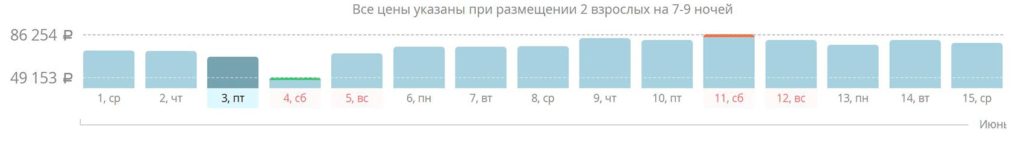 1 ???? Цены на одинаковые туры в разные даты различаются. Если вы при выборе даты поставите отметку плюс-минус 3 дня, то найдете лучшую цену на ближайшие подходящие дни вылета. Еще визуально помогает график календаря дешевых цен. Его можно увидеть на странице с результатами поиска и на странице отеля.
