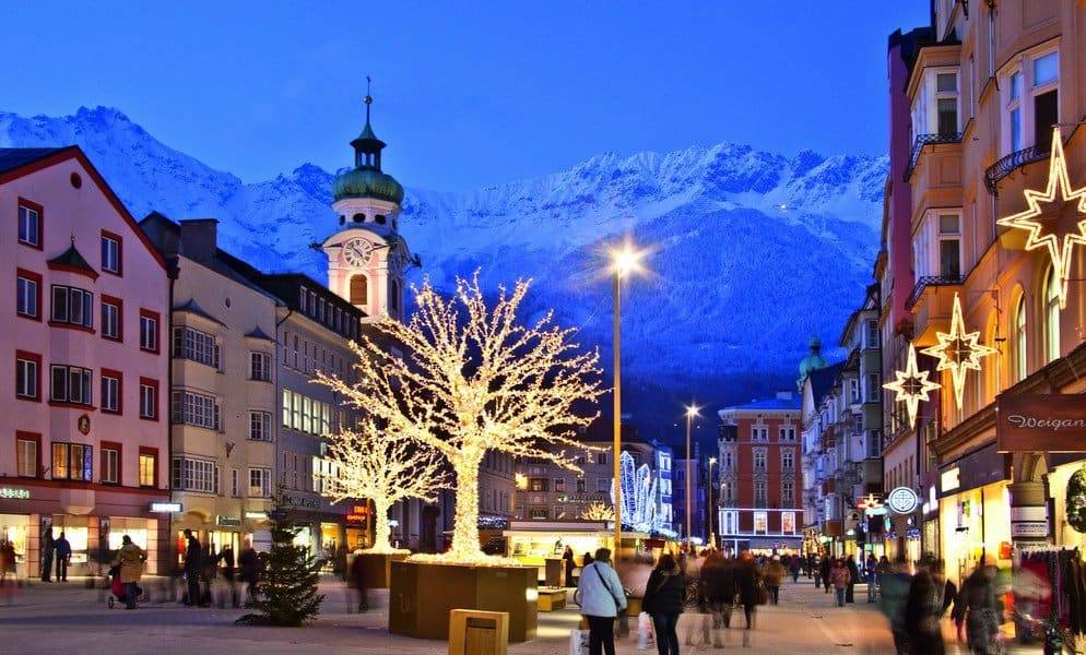 Поднявшись на гору Nordkette на фуникулере, можно увидеть своими глазами и запечатлеть на видеокамеру прекрасный вид, открывающийся на предпраздничный город, сверкающий всеми цветами гирлянд.
