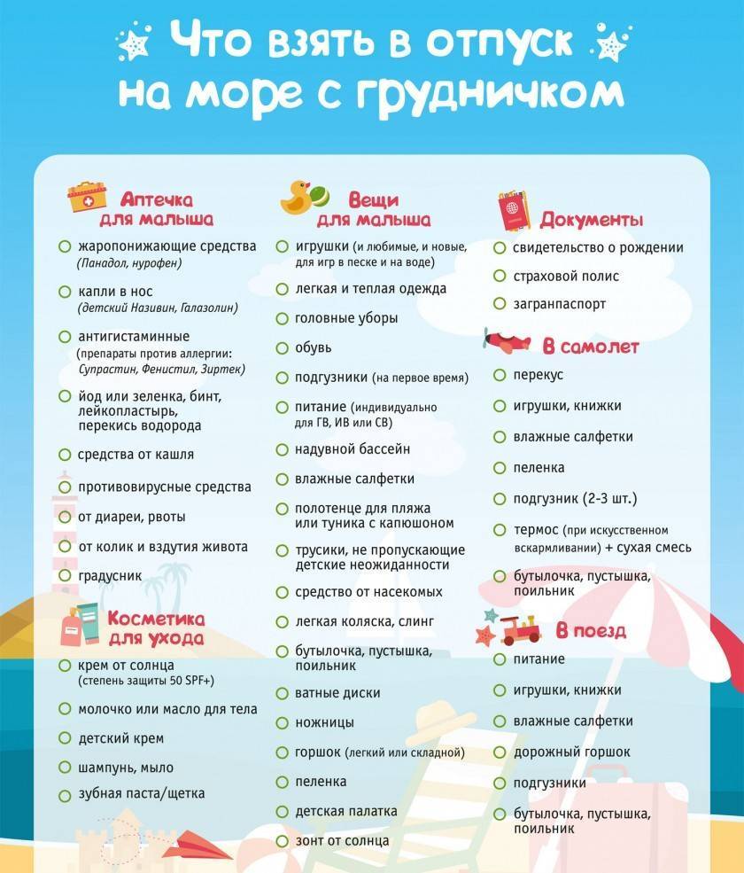 Если предстоит путешествие с грудничком, приведем список, что нужно взять в поездку для малыша: