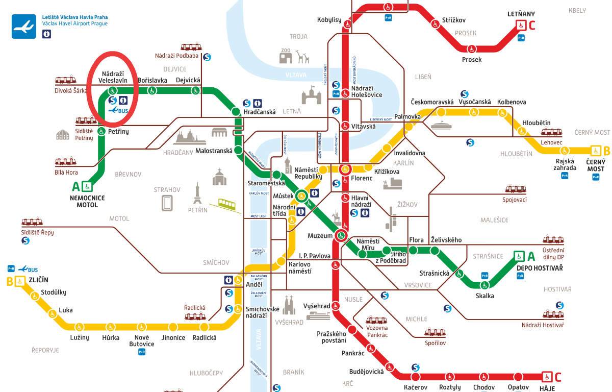 - В случае с автобусом № 199 следуем до конечной остановки под названием Nádraží Veleslavín, там выходим и пересаживаемся на метро линии А.