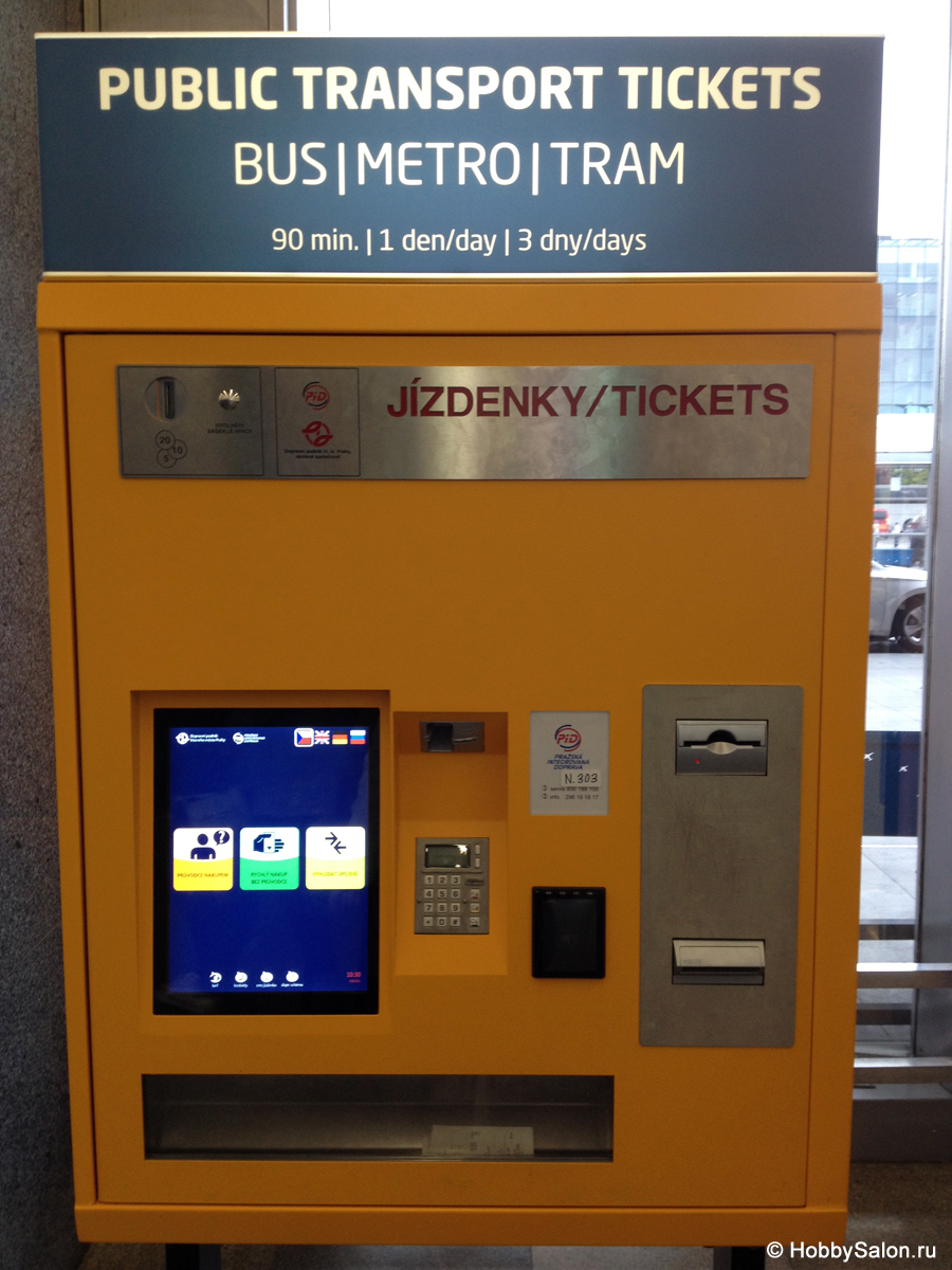 В Чехии существует система единого билета на метро и автобус. Приобрести их можно в специальных автоматах, расположенных в зале терминала (ориентируйтесь на красную вывеску «j?zdenka/tickets»). Кстати, заметьте, что билет рассчитан на определенное время от тридцати минут и дольше, лучше брать на 90 мин, чтобы успеть доехать на автобусе до города и по этому же билету доехать на метро до отеля. Просто вносите нужную сумму (только мелочь, банкноты не принимает) и выбираете длительность действия вашего билета.
