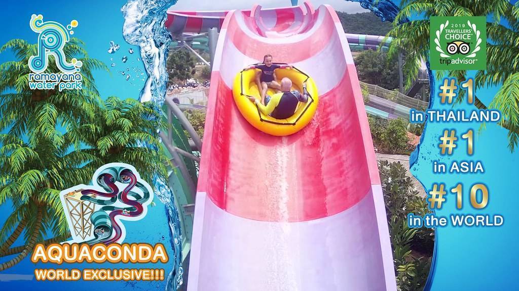 Ramayana Water Park (в переводе Аквапарк Рамаяна) был открыт в мае 2016 года в Паттайе и на сегодня он считается самым масштабным и суперсовременным водным парком Таиланда. Его высокий статус подтверждается, в том числе тем, что он был построен канадской фирмой White Water West, которая лидирует на рынке строительства аттракционов. Здесь даже бассейны наполняются водами из артезианских скважин, а за безопасность посетителей отвечают несколько сотен квалифицированных спасателей. Водный парк Ramayana – это место, где получится не только хорошо развлечься, но и отдохнуть в тени деревьев, сходить в массажный салон, вкусно покушать в ресторанчиках и расслабиться в барах. Видео обзор от русской пары: