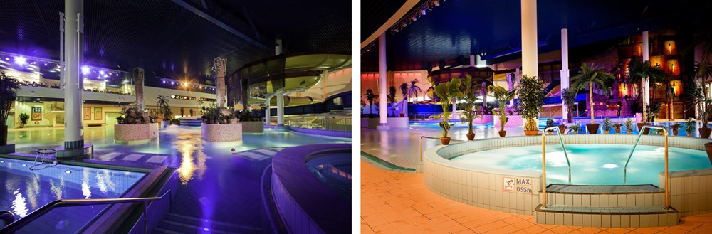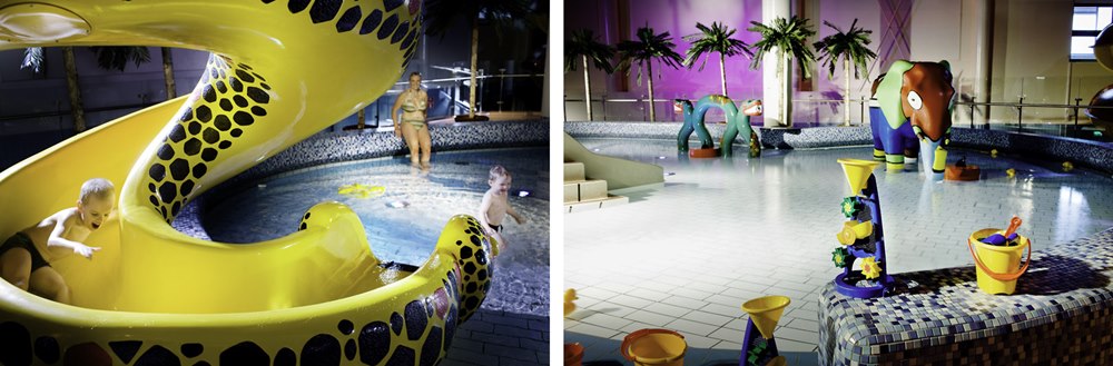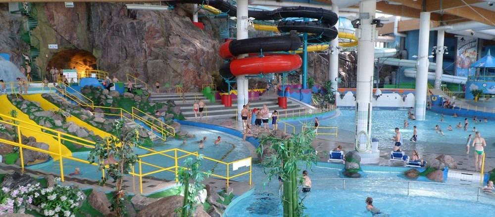 Во-первых, это отличный вид активного отдыха. В этом современном водном парке вы проведете незабываемое время, отдохнете и душой, и телом. Во-вторых, путешествуя с детьми, вы можете быть уверены, что возможность скатиться с водной горки не оставит их равнодушными. Для детей специально предусмотрен отдельный теплый бассейн, специальная сауна, телевизор и скамеечки с подогревом. Без сопровождения детям разрешено посещать бассейн с 12-ти лет.