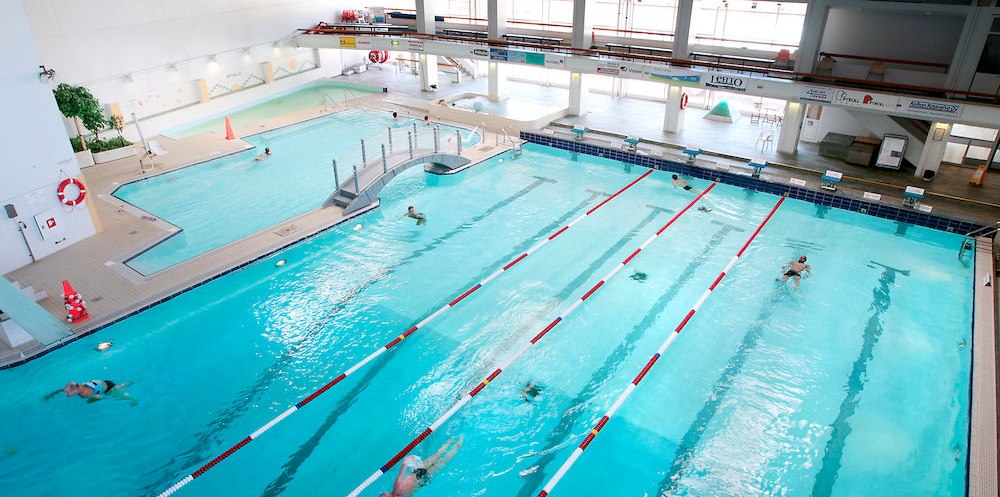 Есть закрытый и открытый плавательные залы. Есть шесть дорожек для плавания, сауны, ванные – джакузи и тёплые детские лягушатники. Так же, к услугам посетителей тренажерные залы, кафетерии и недорогие ресторанчики.