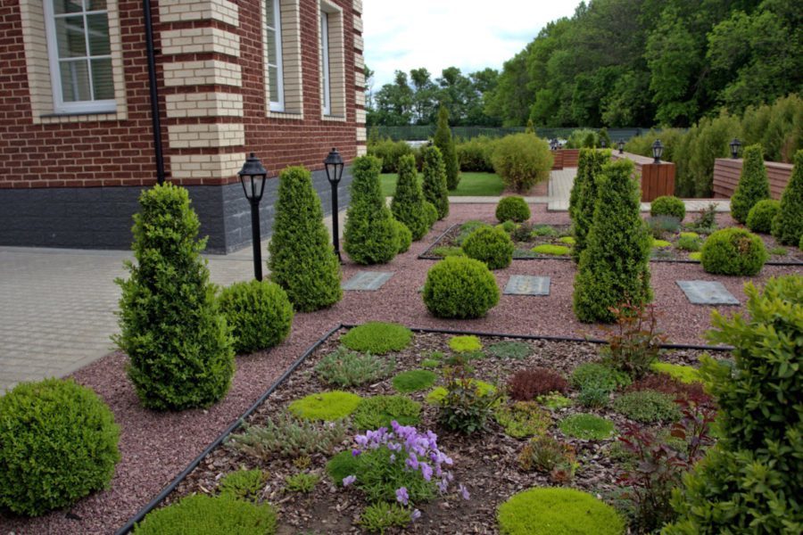 Но цветник должен органично вписываться в общий ландшафтный вид. Для этого его обрамляют газоном или живыми изгородями, геометрически подстриженными кустарниками.