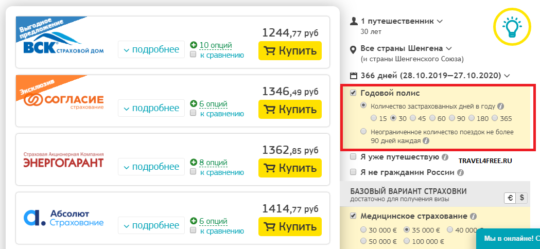 За пару секунд увидите сколько стоит страховка. Все эти полисы подходят для оформления визы и поездки в страны Шенгена, ничего настраивать дополнительно не надо.