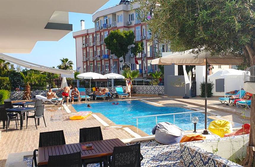 Однако, так как этот отель облюбовали туроператоры, то цены в нем с каждым годом повышаются, а качество падает. Поэтому лучше в этом районе бронировать что-то покомфортнее и подешевле. Для бюджетного отдыха подойдут гостевые дома, апартаменты и мини-отели, которые стоят в 3-5 раз дешевле. Например, соседний мини-отель Eva boutique hotel & Spa — более современные номера, завтрак включен в цену. А поужинать можно в любом кафе рядом. В итоге отдых в Анталье обойдется в 3 раза дешевле, чем во “все включено”, а впечатлений будет больше — местные кафе имеют свой особый колорит, который невозможно прочувствовать во “все включено”. При этом не надо бояться, что чего-то не поймете в кафе, — в меню всегда есть картинки и цены.