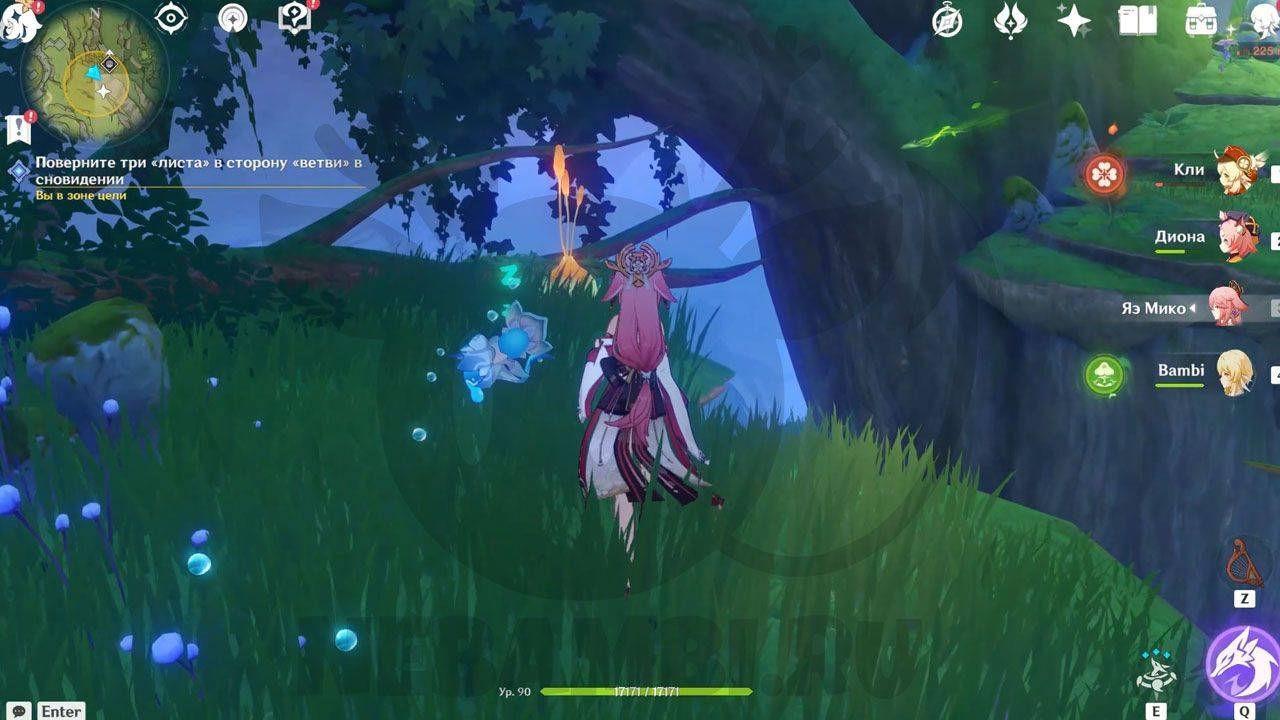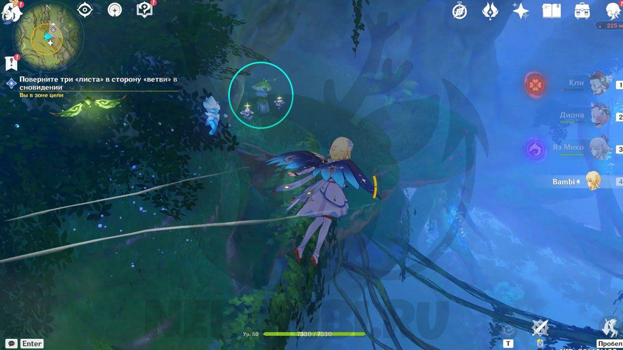 В мире грез нужно повернуть три каменных листа в сторону ветви.