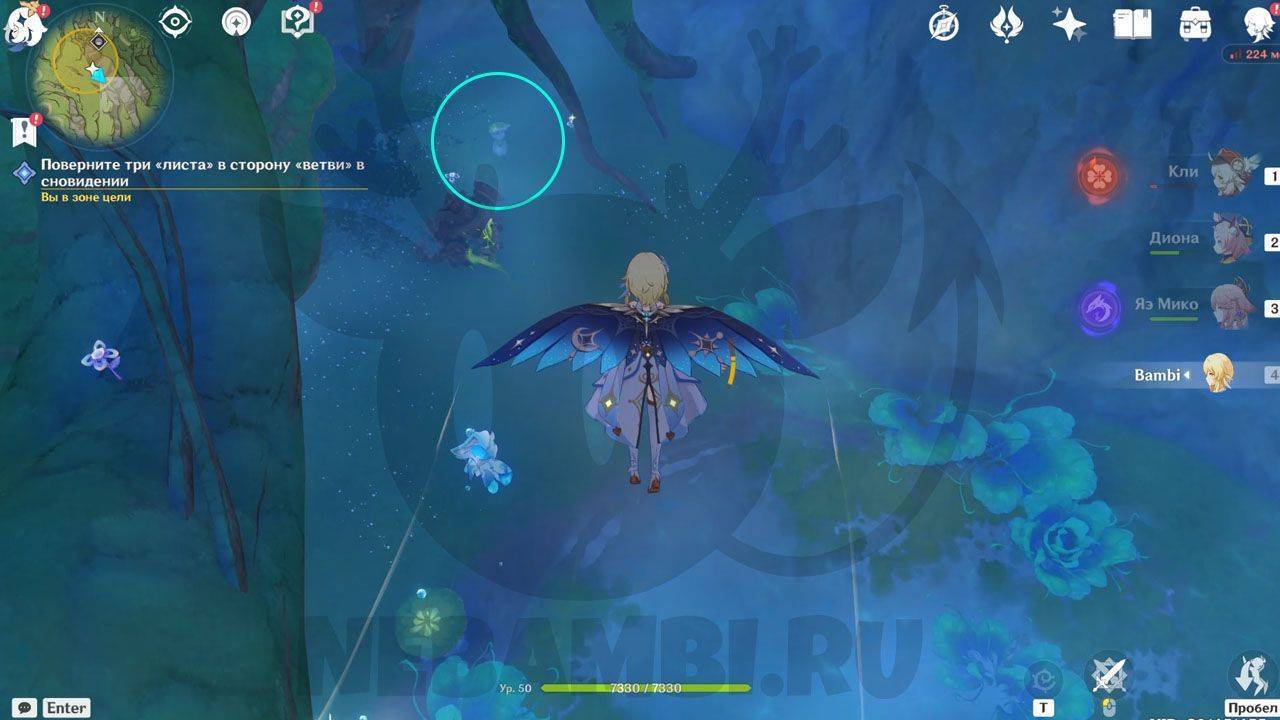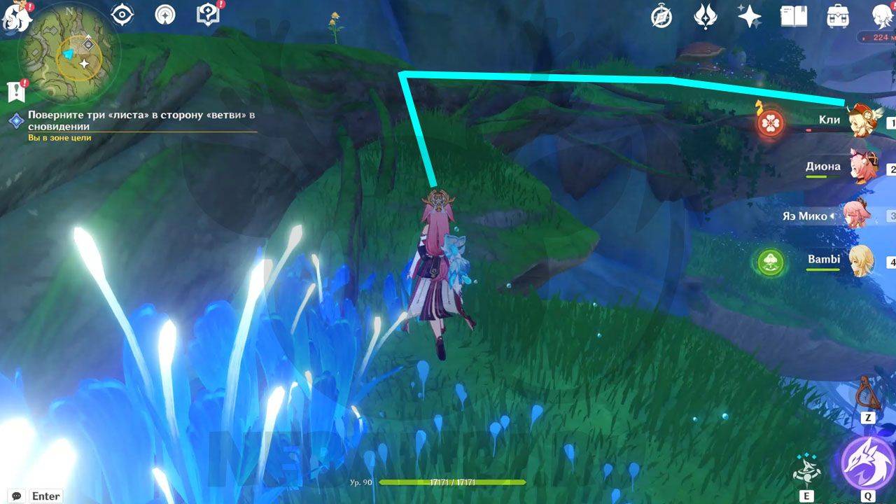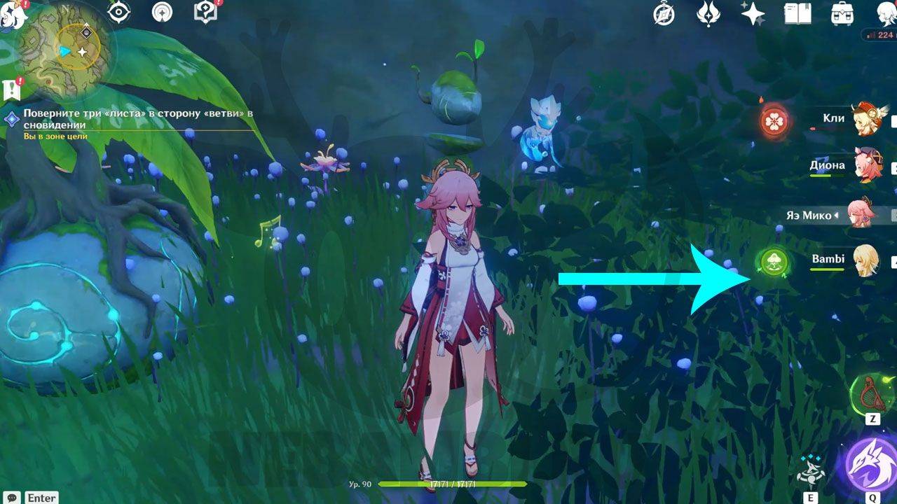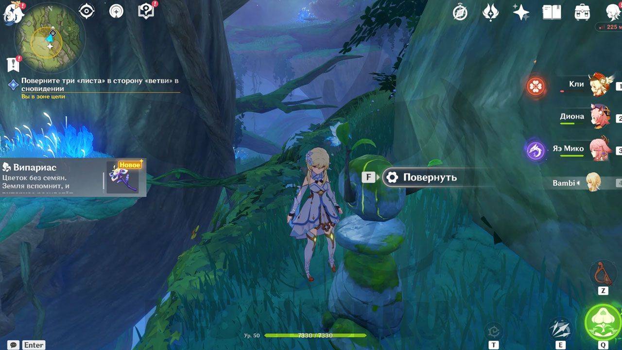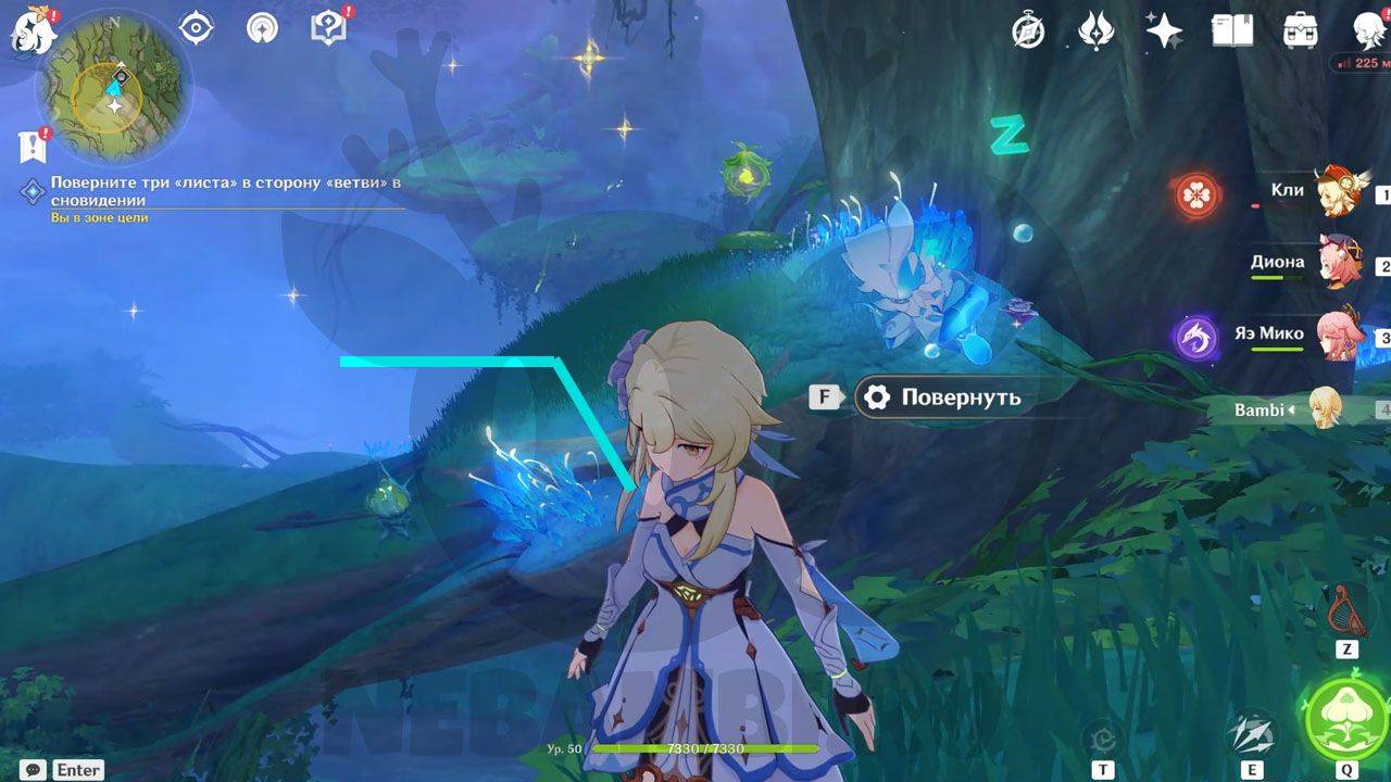 Активируйте Бутон соцветия с помощью Дендро умений, чтобы появились символы, которые помогут вам потом для быстрого перемещения.