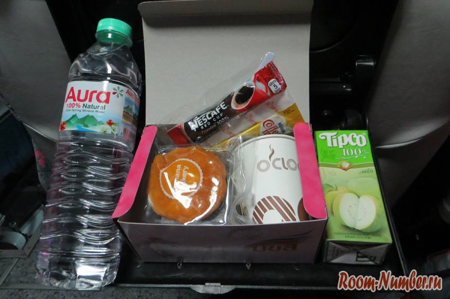 Первым делом, как только мы уселись на свои места, милая девушка принесла нам по бутылке воды, а также выдала каждому по коробочке с растворимым кофе, печенками, банановым мини-кексикок и соком из гуавы. Мы все съели. Ну кроме сока.. Люблю Тайланд! До сих пор пробуем какие-то продукты впервые.