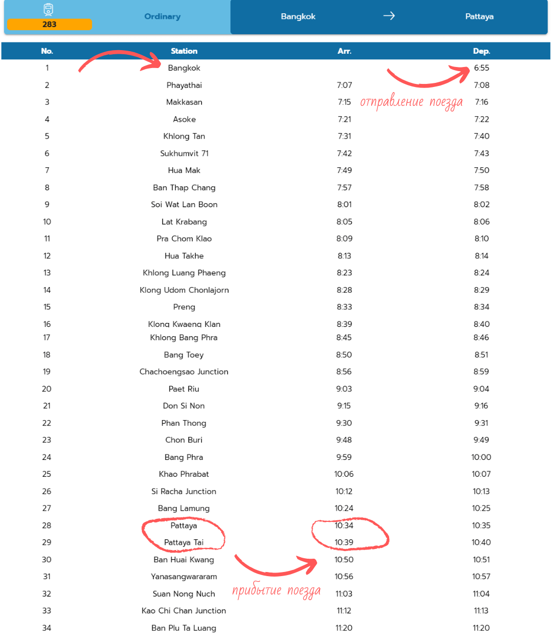 В обратном направлении, из Паттайи до Бангкока поезда отправляются в 14:21. Купить билет можно за полчаса до отправления поезда.