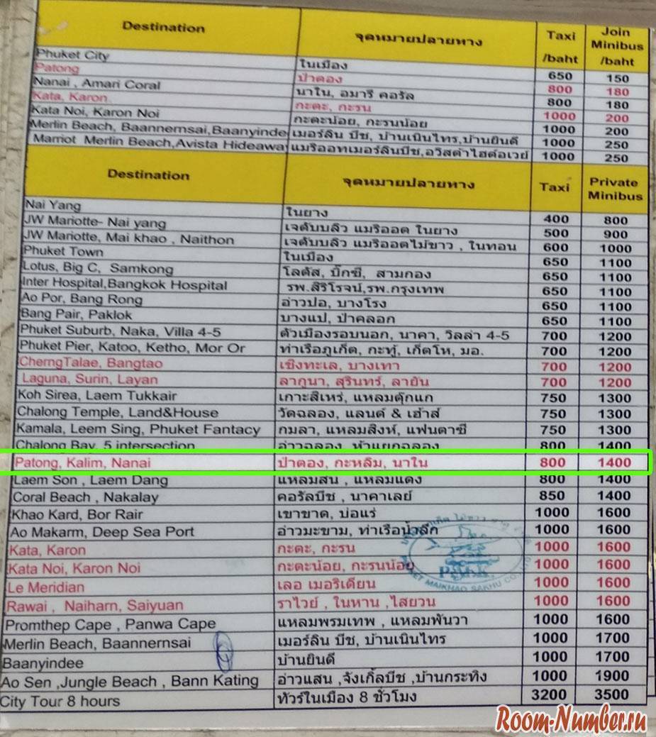 Ценник на такси в аэропорту Пхукета. Такси на пляж Патонг 800 бат