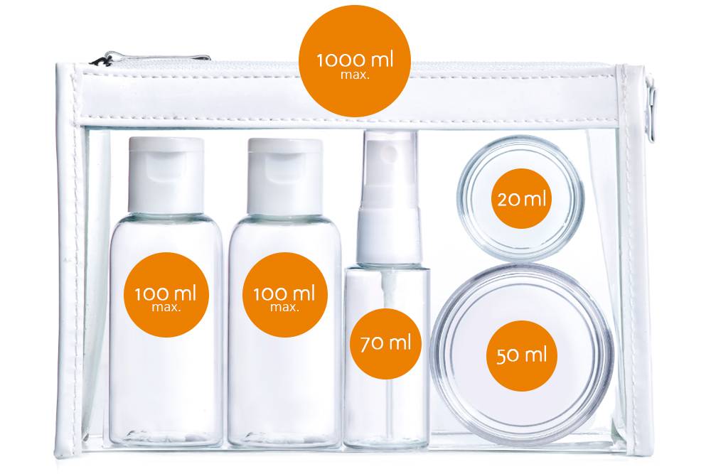- Жидкости перевозятся в пластиковых контейнерах объемом не более 100 мл.