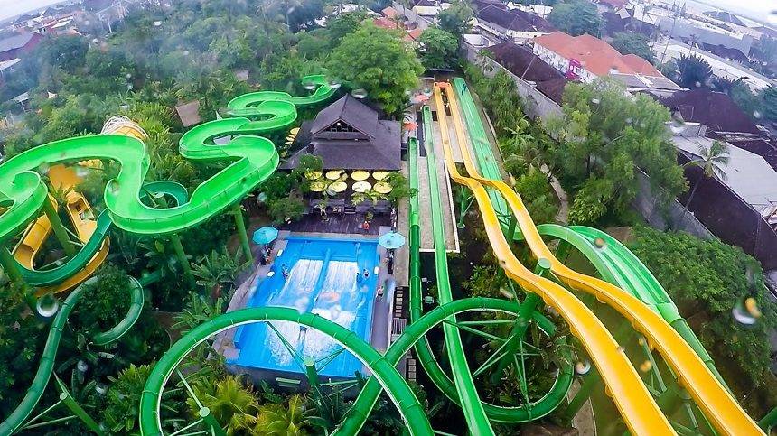 Горки в аквапарке Waterbom разной сложности. Есть совсем простые, а есть и те, которые подкинут в кровь адреналина. Их много, они яркие и всегда полные отдыхающих. По территории всего парка, как бы течет река, по которой можно достичь почти каждого уголка парка развлечений. Аквапарк, действительно, очень хорош, и все высокие оценки в интернете соответствуют истине. Будете отдыхать в Куте, непременно посетите.