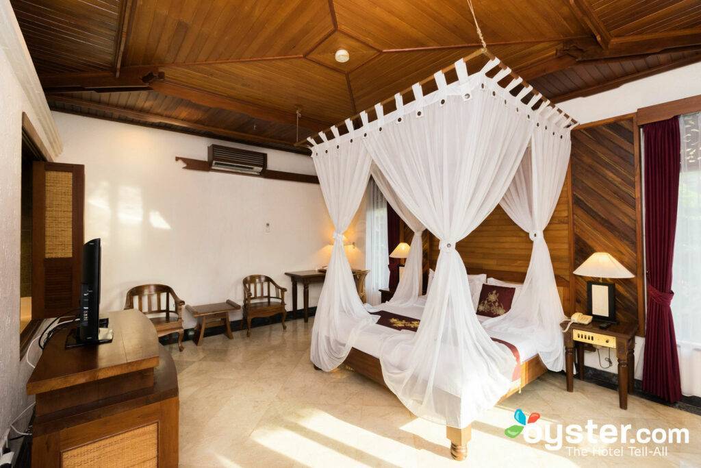 The hotel has a total of 150 rooms, all air-conditioned and housed in large two-story traditional buildings with pitched roofs and wooden verandas. Decor is simple but charming, with lots of wood carvings, gleaming beige floors, and wooden ceilings. Four-poster beds with thick mosquito nets made of natural fabrics add local charm, and burgundy or caramel accents in throw pillows, curtains, and bed runners are elegant touches. Some areas are starting to look a little worn, but rooms are clean and generally well maintained.