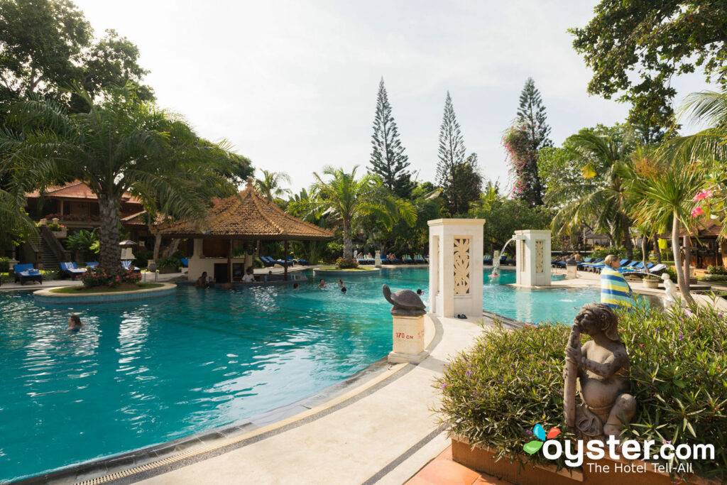 The hotel has direct access to a sandy beach with calm waters. The area for swimming is small, and it is too shallow when the tide is low, but there are several loungers and a wide array of water sports available. All-inclusive rates include free non-motorized water sports, but parasailing, banana boat rides, and jet skiing are an extra fee. The pool is large and appealing, with lots of padded loungers, shaded areas, a kiddy section, and a swim-up bar. There are three restaurants on-site serving Indonesian and international cuisine, but food gets mixed reviews in all of them. A nice breakfast buffet is offered free of charge every morning. Massages, treatments for couples, scrubs and facials are available at the spa, and the fitness center has a few cardio and strength-training machines for a basic workout. The hotel also offers daily fitness and cultural activities, a kids’ club, and free Wi-Fi.