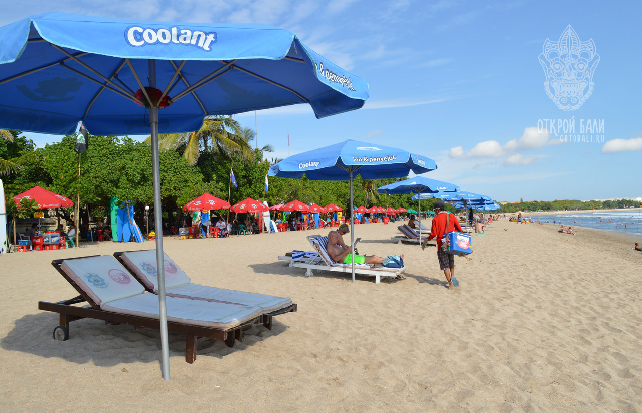 Протяженный, шумный, многолюдный Пляж Кута (Kuta beach) с развитой инфраструктурой. С песчаным дном, не очень чистый. Есть бюджетное жилье и гестхаусы. Бурная жизнь ночью привлекает молодежь. Мекка серферов, несколько серф-школ рассчитаны на русских.