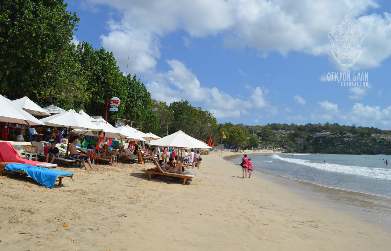 Несколько километров песчаной полосы – пляж Джимбаран (Jimbaran beach). У берега мелководье, глубина начинается дальше. Дно хорошее. Прилив «суживает» пляж до тонкой полосы. Вдоль пляжа вереница отелей со статусом 4* и 5* и рыбных ресторанчиков.