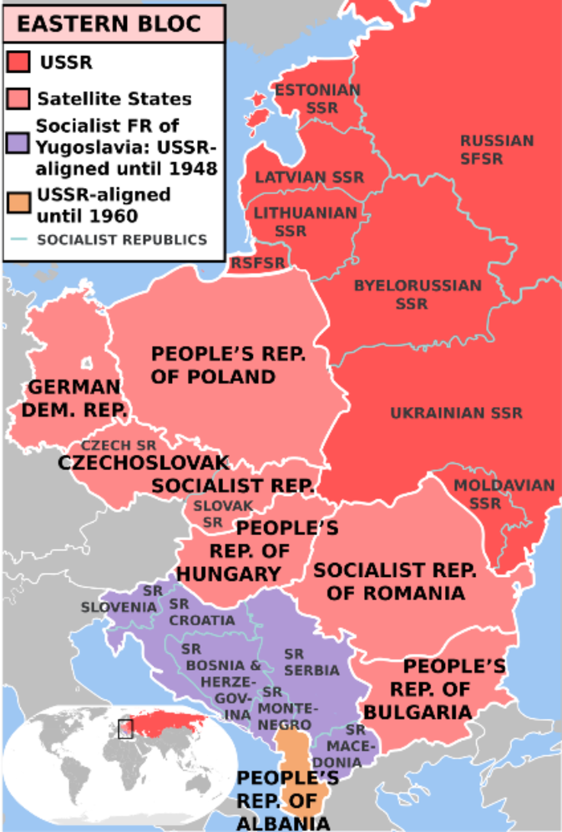 Иногда существует неправильное представление о том, что все государства к востоку от Берлинской стены были членами Союза Советских Социалистических Республик (СССР). В состав СССР входили Эстония, Латвия, Литва, Беларусь, Украина и Молдова. Государства-сателлиты включали Польшу, Чехословакию, Венгрию, Болгарию и Румынию. «У каждого было коммунистическое правительство; на Западе их называли сателлитами, потому что они крепко держались за Советский Союз, как спутники вокруг планеты »(Schoolhistory.org.uk).