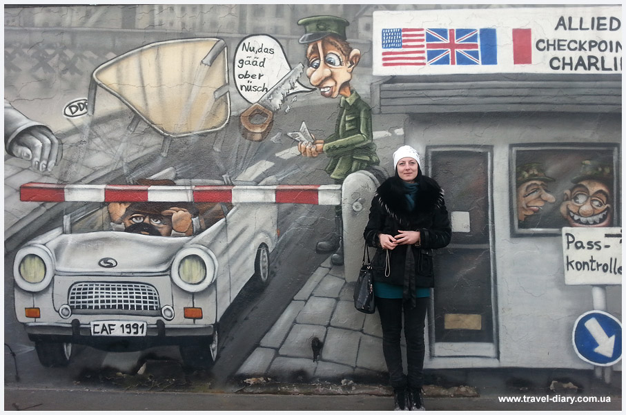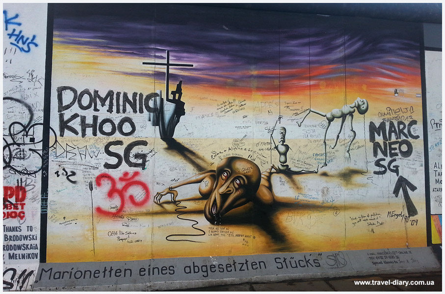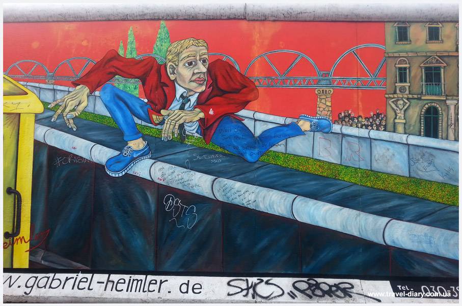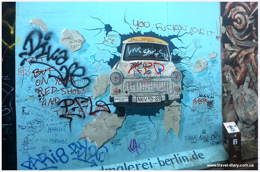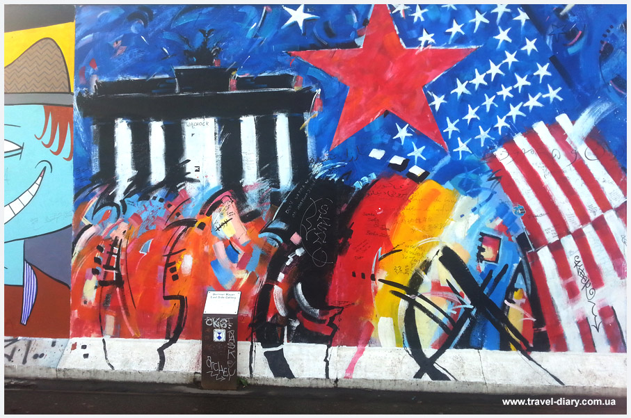 Яркие граффити украшают высоченную бетонную стену. Теперь здесь целый мемориальный комплекс «East Side Gallery». Он располагается на улице на ул. Мюлен-штрассе (Mühlenstraße) в берлинском районе Фридрихсхайн (Friedrichshain) по которой проходила граница между ГДР и Западным Берлином. Ее создали 118 художников из 21 страны в 1990 году, расписав Берлинскую стену кистью и баллончиками для граффити. К 20 годовщине падения Берлинской стены была тщательно отреставрирована «Галерея восточной стороны» (East-Side-Gallery).