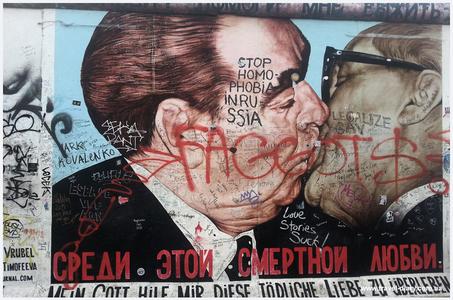 До этих пор можно полюбоваться на знаменитое граффити Берлинской стены, которое создал Дмитрий Врубель «Братский поцелуй» Брежнева и Хонеккера. После падения стены, когда Брежнева не было среди живых, художник Врубель, начал работу над созданием этого известного творения. Внизу «картину» обрамляет надпись “Господи! Помоги мне выжить среди этой смертной любви”.