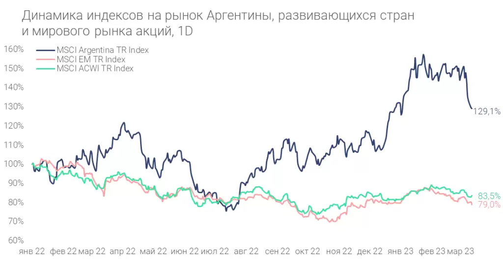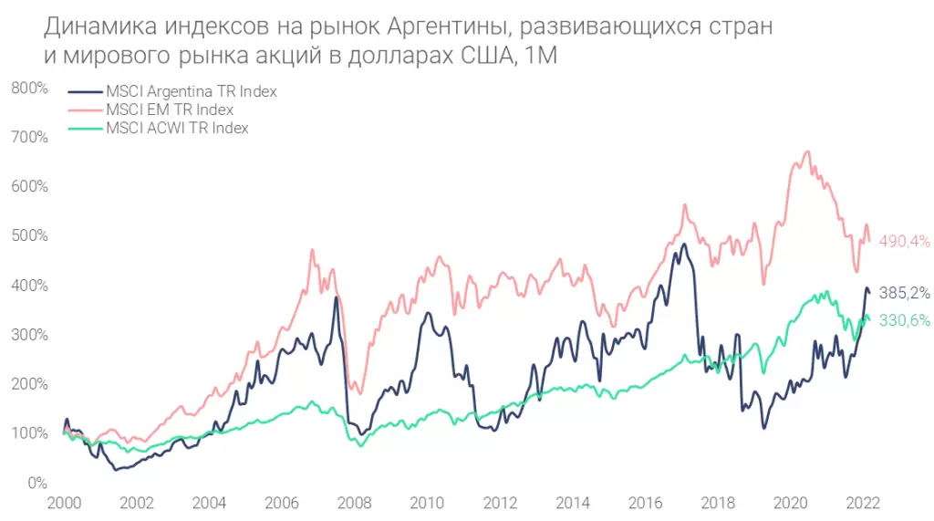 С начала столетия до середины 2018 года индекс аргентинских компаний почти всегда превосходил по доходности индекс мирового рынка акций, однако впоследствии растерял накопленное преимущество, и период превосходства сменился периодом отставания. С наступлением 2023 года аргентинский индекс вновь обошел мировые акции (совокупная доходность за период составила 385,2% и 330,6% соответственно).