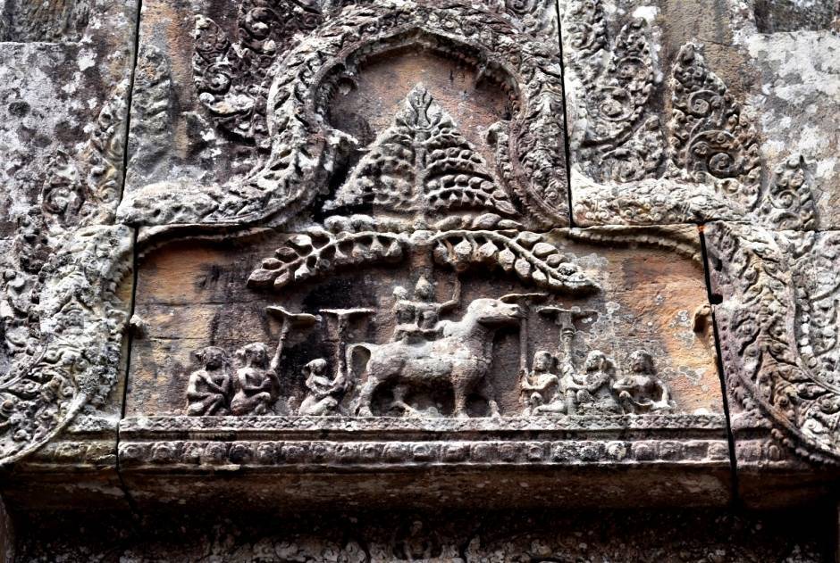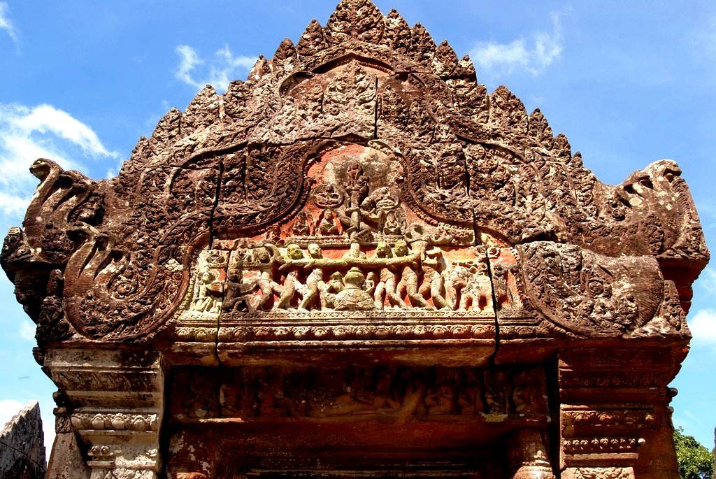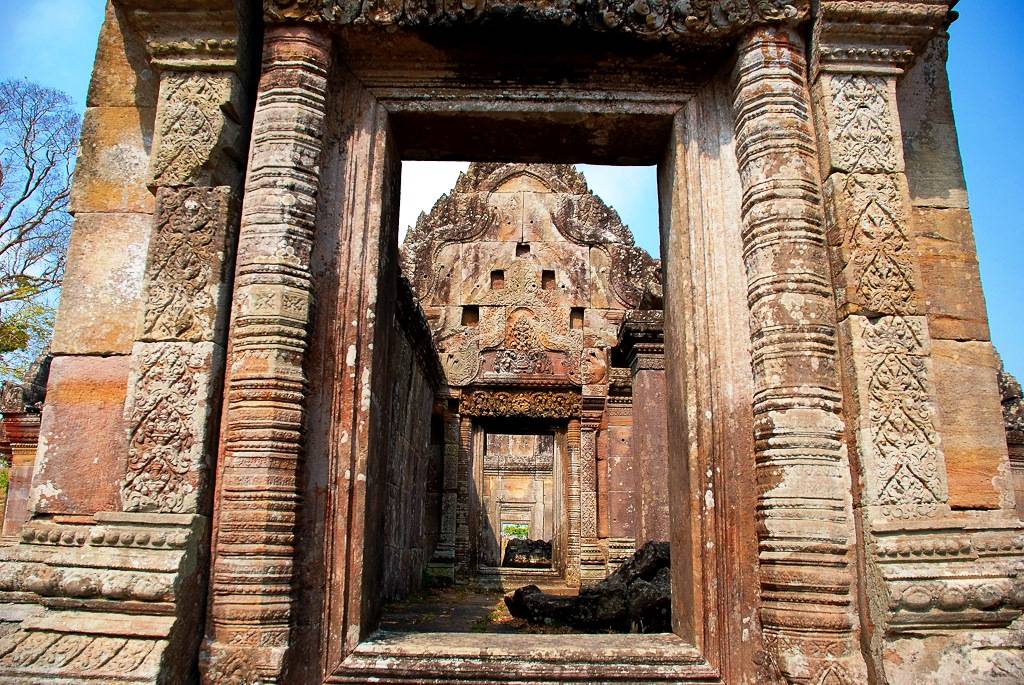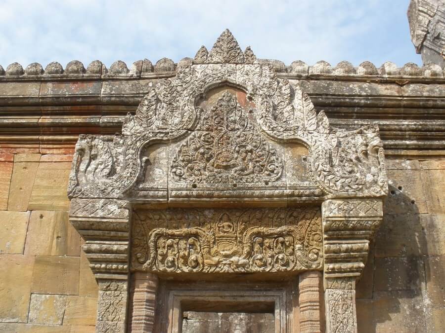 Последовательные шаги приводят паломников к главному святилищу на вершине утеса. Дорога ведет через богато украшенные врата, называемые Гопура (на одних до сих пор сохранились следы оригинальной красной краски, которая использовалась для украшения ворот), дворы с библиотеками или меньшими святилищами. Подъем по лестнице и прохождение следующих порталов и уровней является умышленным кхмерским трюком. Это должно усилить ощущение “очищения” и “приближения” к престолу богов. От центрального двора, вымощенного камнем, можно пройти к следующей лестнице с семиглавыми змеями (выполнены из цельного камня).