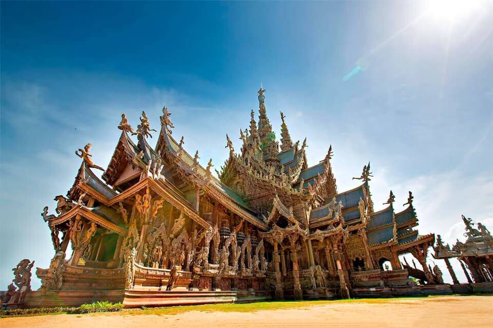 Самый большой деревянный храм в мире. Строится он с начала 80-х годов прошлого века и конца стройке пока не видно. Идея возведения сооружения, в котором нашлось бы место для паломничества приверженцам всех религий Востока, пришла миллионеру Леку Вирияпханту, после смерти которого процессом руководит его сын. Храм представляет собой поистине грандиозное сооружение: он строится из тикового и железного дерева без гвоздей (хотя последние хорошо видны на стенах, но тайцы обещают их вытащить по завершении строительства).