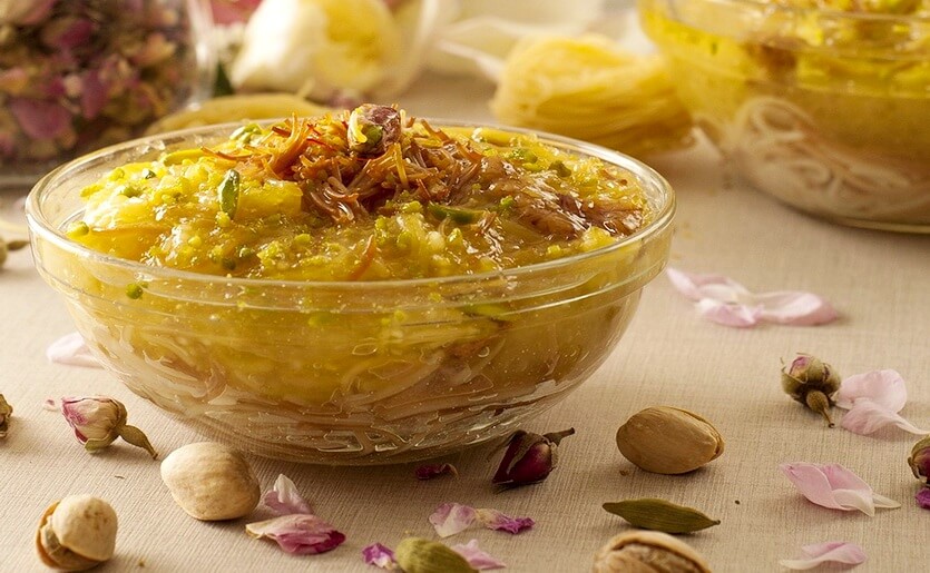 Сладкая вермишель с кардамоном и соленым омлетом. Звучит странно, но советуем не упускать возможность попробовать это блюдо в Дубае. В ресторанах национальной кухни его готовят к завтраку. Тонкую отварную лапшу слегка обжаривают во фритюре, чтобы она стала золотистой и немного похрустывала во рту. Омлет готовят отдельно, а затем мелко рубят или сворачивают конвертом, чтобы наполнить сладкой начинкой. Неповторимую пикантность придает соус на основе кардамона: пряный, приторный, тягучий. Угощение напоминает пудинг и запеканку. Вкус даже не с чем сравнить – вряд ли вы пробовали что-то подобное раньше. Блюдо одновременно сладкое, соленое и пряное – обязательно попробуйте.