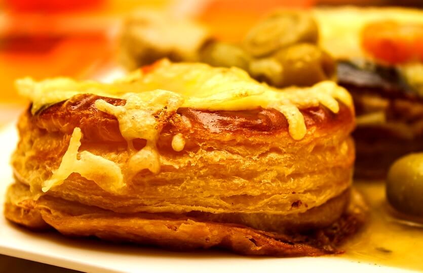 Пикантная французская закуска, которую нужно обязательно попробовать гурманам. Это пикантное блюдо во Франции принято подавать для разогрева аппетита (хотя волован довольно сытный, им можно и голод утолить). Vol au vent – аккуратная полая башенка из румяного слоеного теста. Ее диаметр может варьироваться от 3 до 20 см. Отверстие заполняется вкусным фаршем на основе мяса, морепродуктов, грибов или овощей. Настоящий деликатес французской кухни – волован с трюфельной начинкой. Некоторые виды закуски дополнительно запекают в печи, чтобы наверху образовалась аппетитная корочка.