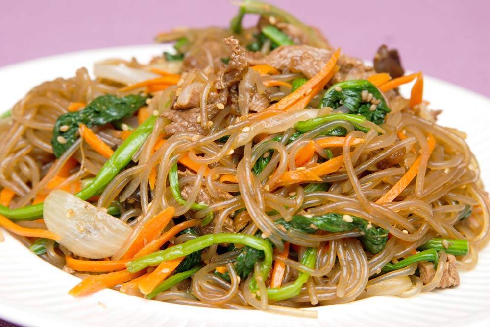 Чапче. Крахмальная лапша с мясом, обжаренными овощами и кунжутным маслом. Может иметь разные названия в зависимости от основного ингредиента (корейский колокольчик, душистый лук, красный острый перец, грибы). Ни одно застолье в Корее не обходится без этого блюда.