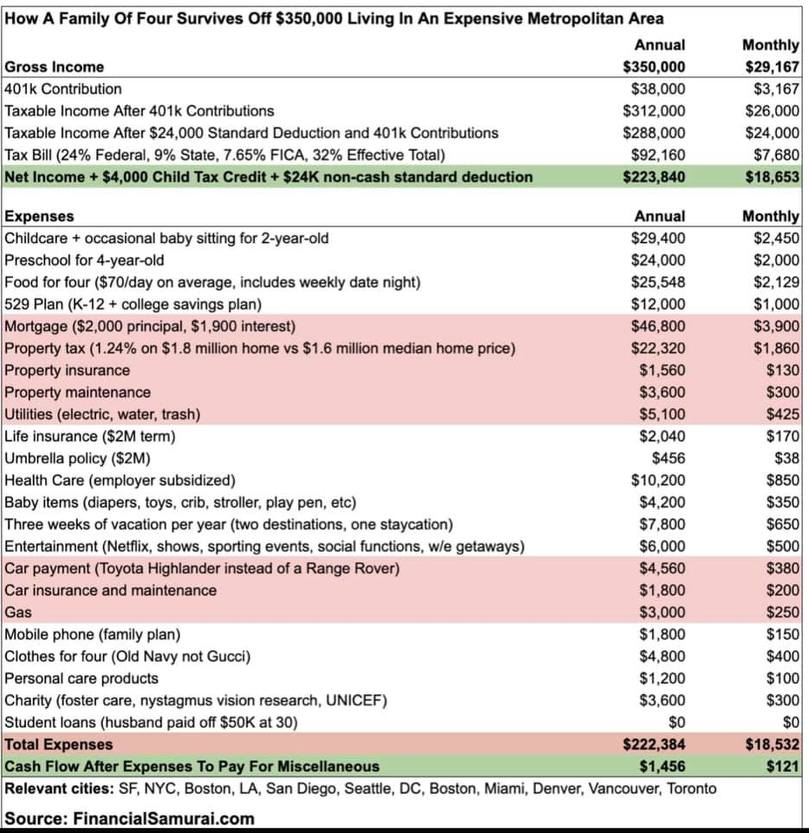 Ниже дана табличка от Financial Samurai по структуре расходов среднестатической семьи среднего класса из 4-х человек, проживающей в Нью-Йорке, Вашингтоне, Бостоне, Сан-Франциско, Лос-Анджелесе.