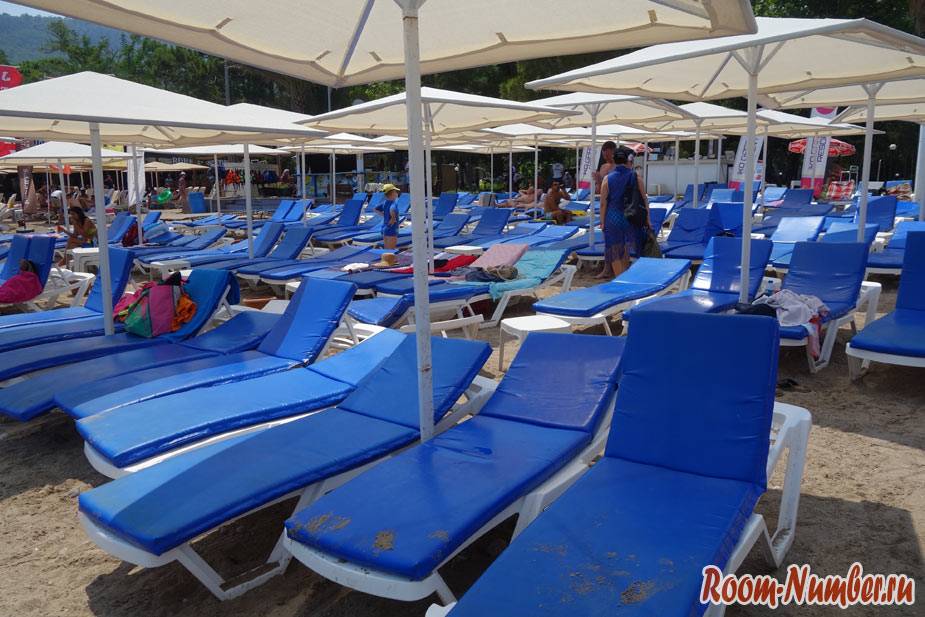 Просто бросить вещи на песок и не платить за лежак проблематично. Но в самом центре есть небольшая полоска пляжа, шириной 3-4 метра, которая не принадлежит пляжным клубам. Там можно расстелить полотенце и никто вас не прогонит.