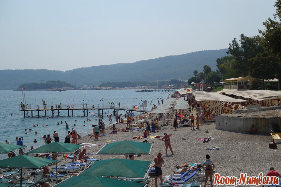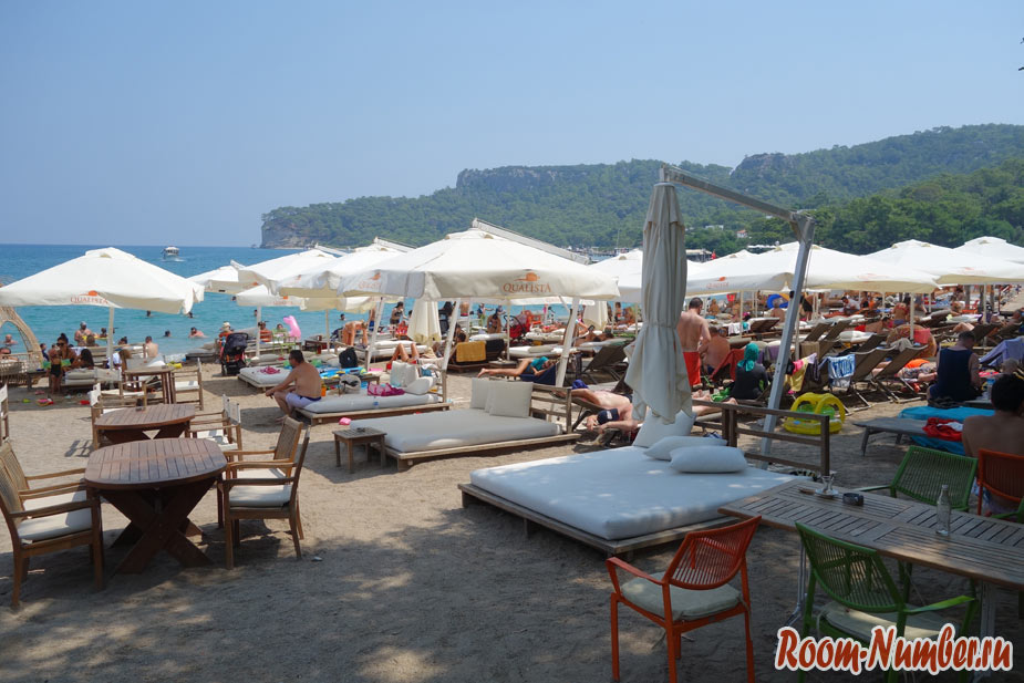 Песочный пляж в Кемере чуть более, чем полностью застроен пляжными клубами. Весь берег заставлен платными шезлонгами. В центральной части ресторан Roberts coffee, в котором мы каждый день обедали.