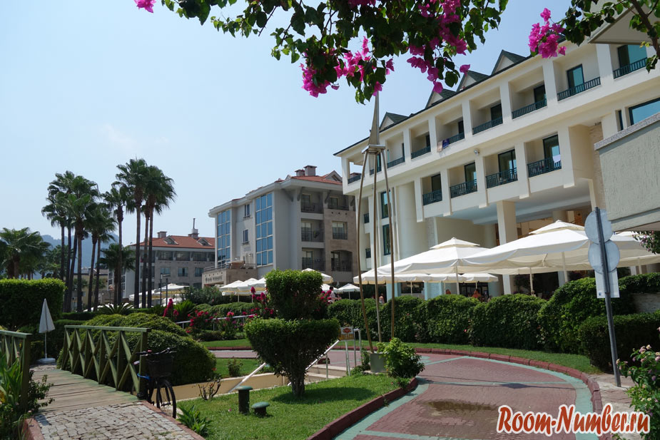 За пределами пляжа сходства с Крымом заканчиваются. Ухоженная территория с цветочками, аккуратные дорожки и приличные отели на первой линии.