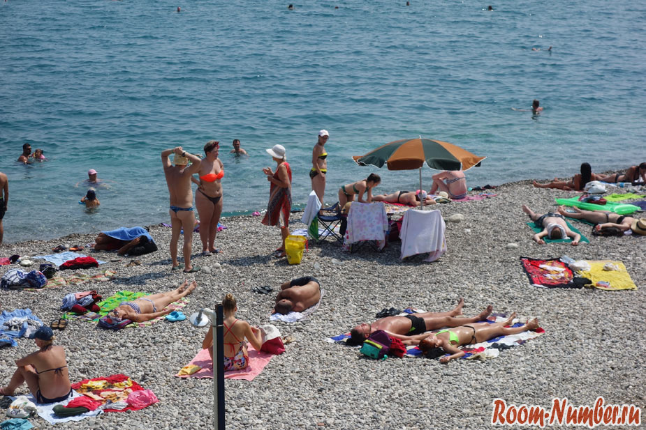 Уже сверху виднеются бесконечные зонтики, под которыми греют тельца отдыхающие. Даже контингент людей один в один, как в Коктебеле или Новом Свете. Пляж средних размеров, но далеко не маленький. Береговая линия узкая. Лежаки помещаются, но все лежат кучненько, о свободном пространстве мечтать не приходится.