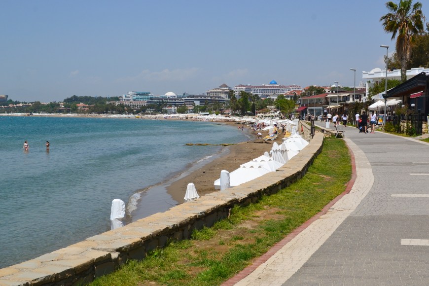 Пляжи справа от античного города менее красивые. Здесь пляж сильно уже, многие участки поделены на территории для отелей, поэтому посторонний человек здесь не может загорать на своем полотенце. Зато здесь длинная набережная, самое то для длинных прогулок, пробежек и катания на велосипеде.