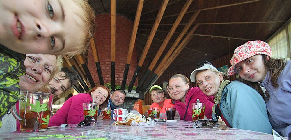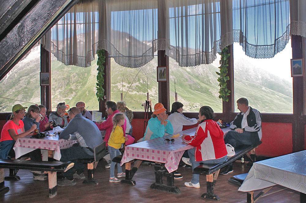 Наблюдать за окружающими видами можно не только глядя в панорамные окна кафе, но и с открытой веранды, расположенной над пропастью. На дощатом полу стоят широкие столы и удобные, надежно сколоченные лавки, а потрясающие панорамы и чистый горный воздух – отличное подспорье для разгулявшегося аппетита.