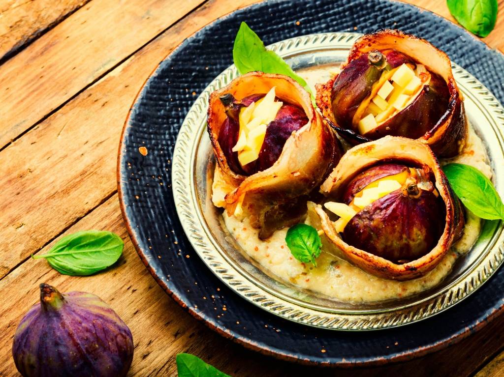 - Оберните полоску бекона вокруг каждой половинки инжира и закрепите зубочистками.