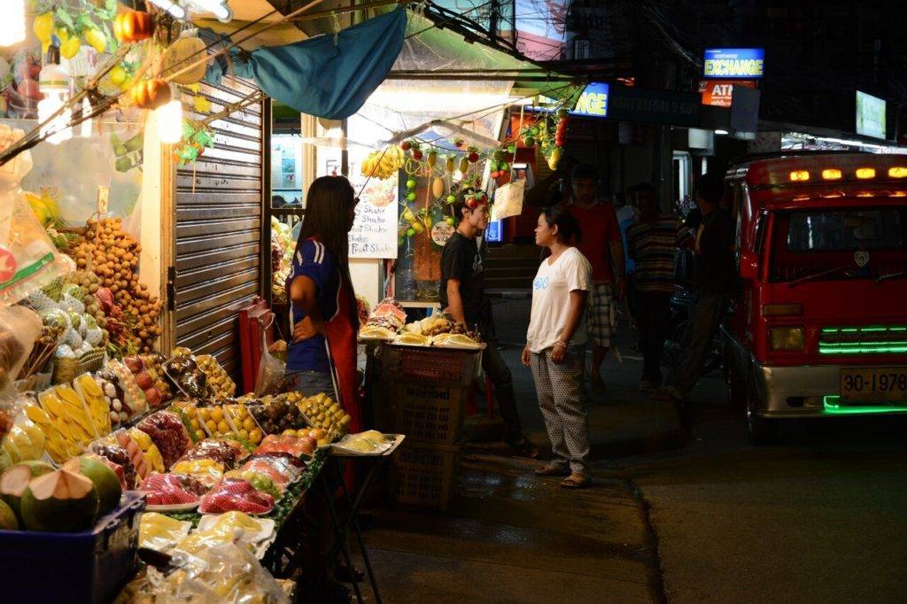- Главным излюбленным местом туристов, где можно вкусно и разнообразно поесть, по праву, считается ночной рынок, который открывает свои двери после заката солнца. Он расположен за торговым центром Jungceylon. здесь у обычных туристов разбегаются глаза от всего многообразия продуктов. Экзотические фрукты и овощи, мясо, морепродукты, все очень свежее. На рынках имеются специальные места, где купленные вами продукты сразу же приготовят. Также здесь есть передвижные макашницы которые предлагают отведать шашлычки из мяса и морепродуктов, свежую выпечку и недорогие напитки. Цены на продукты ниже средних, но даже и их можно сбить, если умело торговаться с продавцами. Выпечка от 20 бат, суп от 30 бат, мясо на гриле — 40 бат, морепродукты — 60 бат.