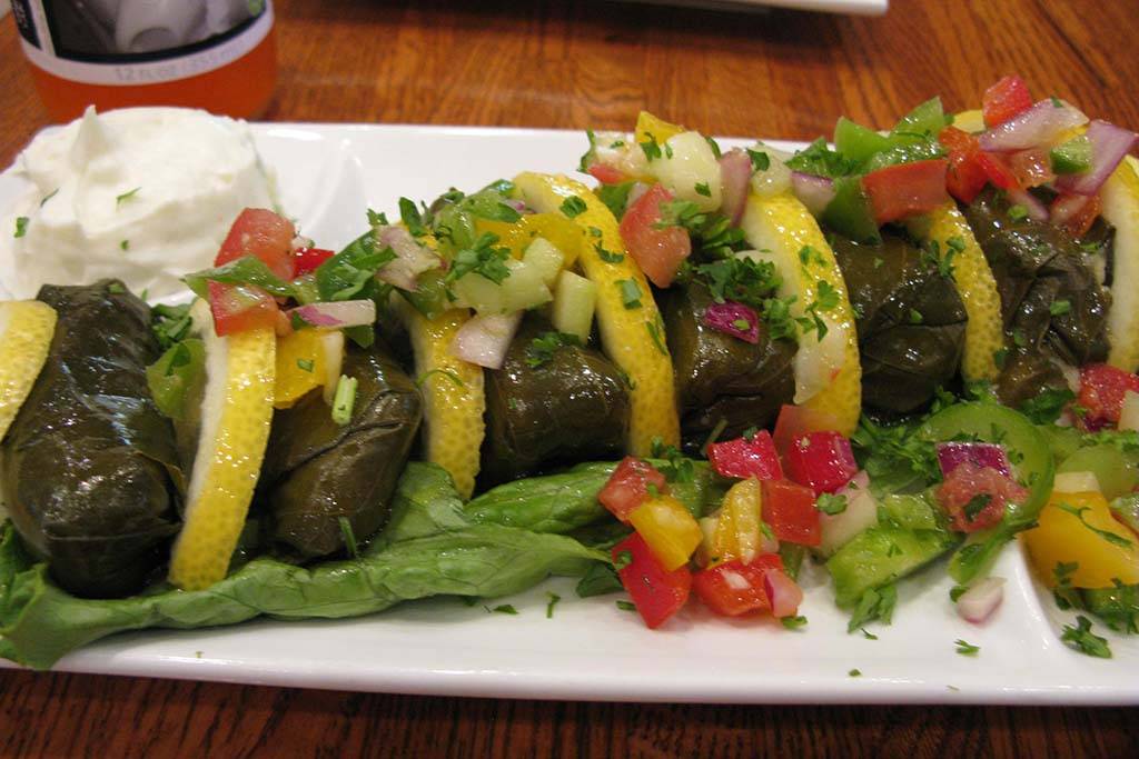 Долма — голубцы из виноградных листьев, риса и трав (мяты, петрушки, укропа). Подается с лимонно-яичным соусом