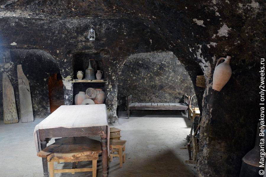 Внутри хранятся старинные артефакты: шлемы воинов, древние монеты и вазы, есть даже светильник, которому несколько тысяч лет. В некоторых из 30-ти номеров установлены краны с вином — они вмонтированы прямо в пещерные стены.