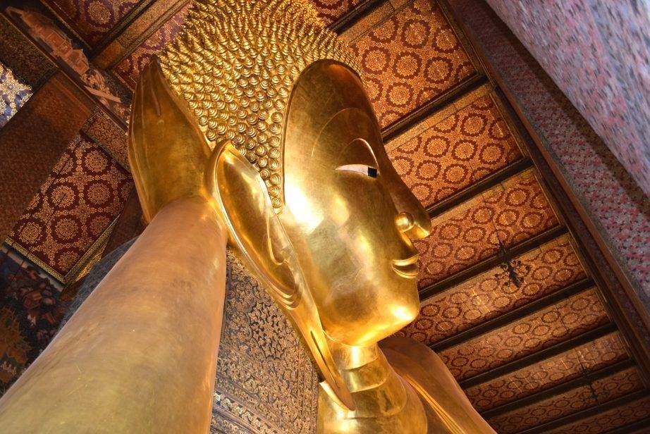 То ради чего ежедневно стекаются сюда толпы туристов — это огромная 46 метровая статуя Лежачего Будды со ступнями покрытыми слоем золота, под которой покоится прах короля Рамы I. Его еще называют отдыхающим, спящим, медитирующим и даже умирающим. На последнего он похож меньше всего, так как он улыбается)